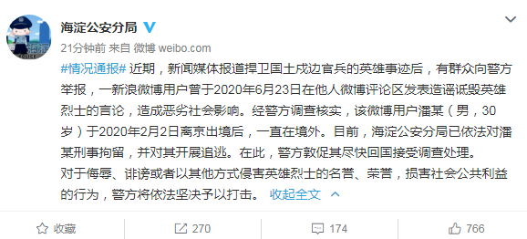 据北京市海淀公安分局官方微博通报,近期,新闻媒体报道捍卫国土戍边官兵的英雄事迹后,有群众向警方举报,一新浪微博用户曾于2020年6月23日在他人微博评论区发表造谣诋毁英雄烈士的言论,造成恶劣社会影响。