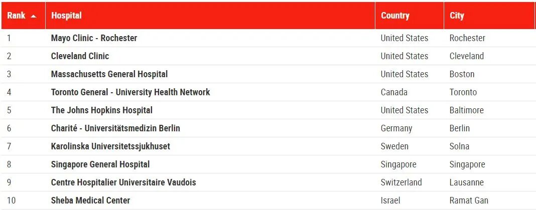 - 多伦多的Mount Sinai Hospital排名第30位,得分为89.35%;