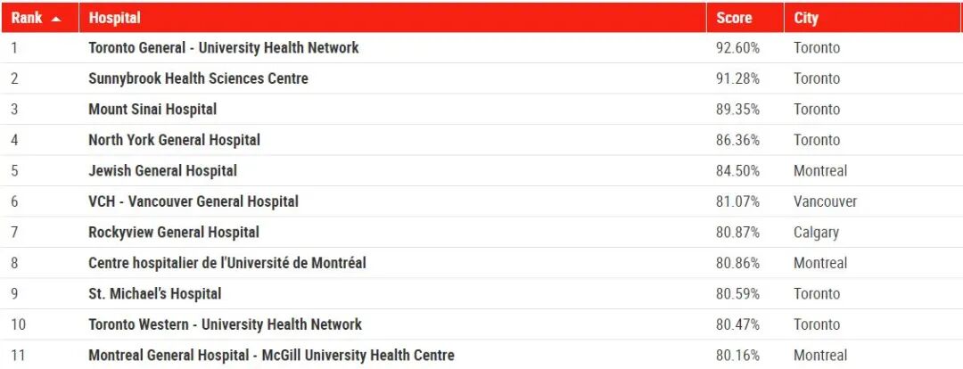 - 多伦多的Sunnybrook Health Sciences Centre排名第26位,得分为91.28%;