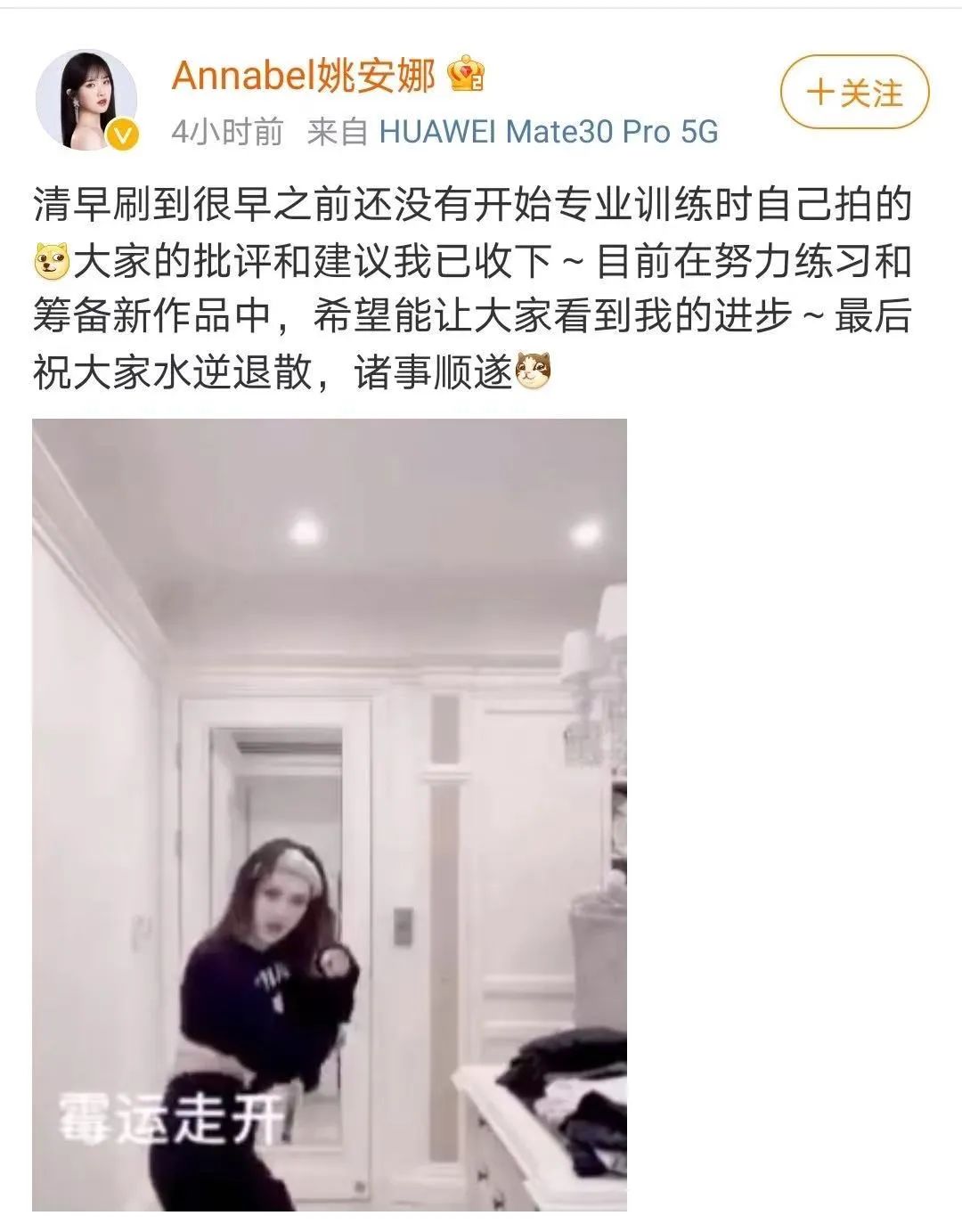姚安娜随后马上做出回应,称视频是在接受专业培训之前拍的,跳的虽然不好但是虚心接受大家批评,还自己p了个“水逆退散”的表情包自嘲。