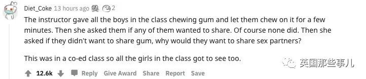 “老师给班里所有的男生发了口香糖,她让他们嚼上几分钟,然后问有没有人愿意把自己嘴里的口香糖分享给别人,当然没有人愿意。