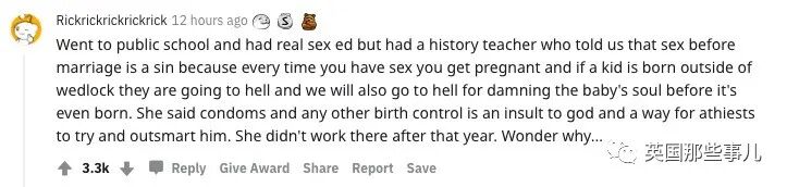 但有个历史老师告诉我们,婚前性行为是一种罪,因为每次做爱都会怀孕,如果孩子不是婚内所生,孩子们就会下地狱,他们的父母也会因为在出生前就毁掉孩子的灵魂而下地狱。