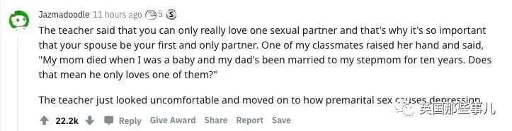 老师脸色一下就变了,连忙换了个话题,开始给我们解释婚前性行为是怎么导致人患上抑郁症的。”