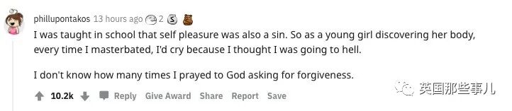 “学校教育我们说,自慰也是一种罪。所以,作为一个刚刚开始探索自己身体的年轻女孩,每次自慰,我都会大哭一场,因为我担心自己要下地狱。