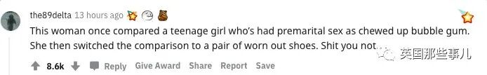 “有个女人曾把一个有过婚前性行为的少女比作被嚼过的泡泡糖,还说像一双破鞋。这人太坏了。”