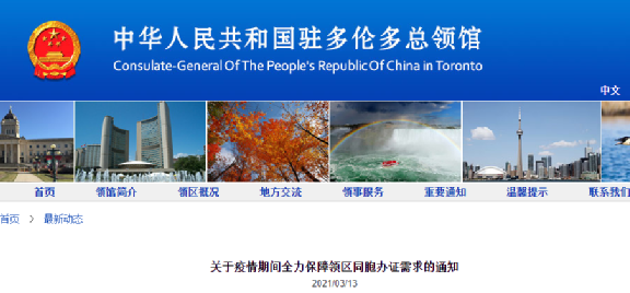 为满足领区同胞的办证需求,中国驻多伦多领事馆当地时间3月13日在其官网发布关于疫情期间全力保障领区同胞办证需求的通知,表示该馆将进一步增加领事证件办证量,全力提升领事证件服务效能。