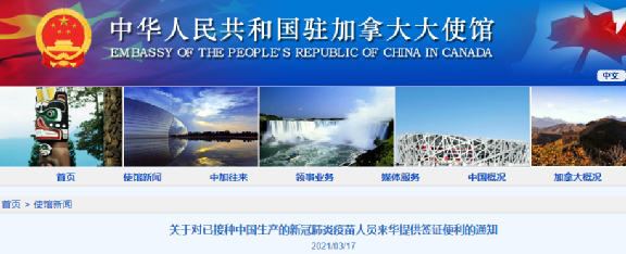 【加拿大乐活网lahoo.ca 程序综述】当地时间3月17日,中国驻加拿大大使馆在其官网发布了关于对已接种中国生产的新冠肺炎疫苗人员来华提供签证便利的通知。