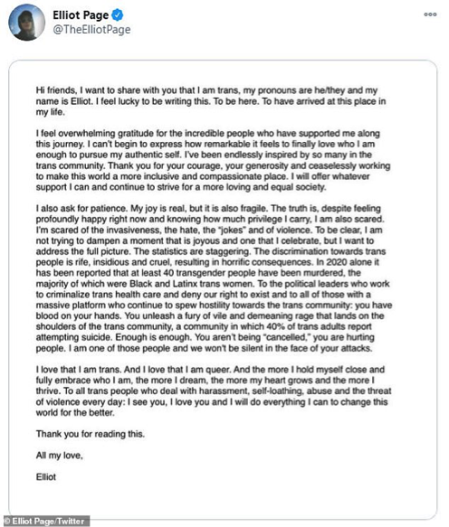 他说:“我终于能够接受变性,完全成为真正的自己。”去年12月,佩吉首次以跨性别身份公开露面。
