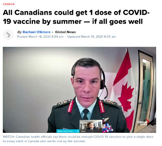 全权负责加拿大疫苗后勤工作的Dany Fortin少将3月18日在接受采访时表示,如果所有经卫生部批准的疫苗都以目前最快的速度进行配送和接种,那全国所有有资格接种新冠疫苗的人,都能在今年夏季之前都能至少打上第一针。
