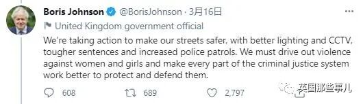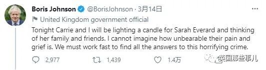3月14日,英国首相Boris Johnson公开为Sarah的遇害表示哀悼。