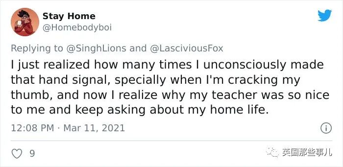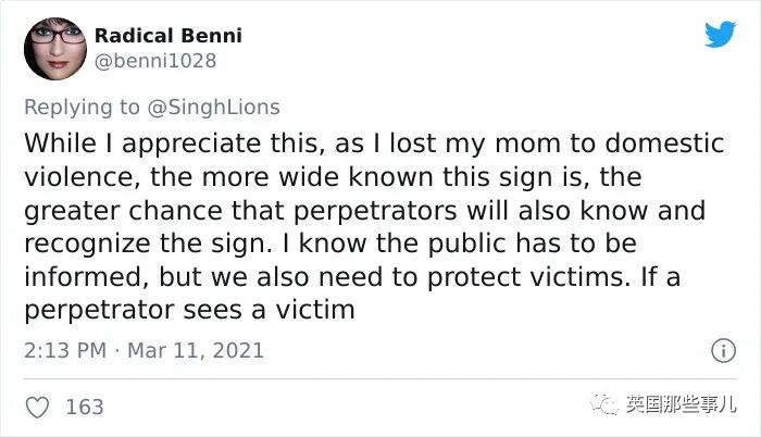Slumber啵:如果大多数人看不懂,就没有办法求救成功,但反之如果过于普及每个人都知道的话,家暴者也能看懂,也可能会为了阻止进行更严重的暴力呀