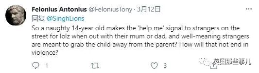 “所以当一个14岁的淘气孩子和他的父母出门的时候,在街上向陌生人发出这个求救信号,那么好心的陌生人是要把孩子从父母身边抢走吗?这怎么可能不以暴力收场?”
