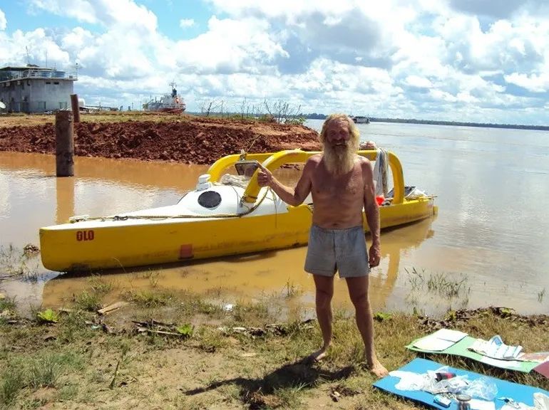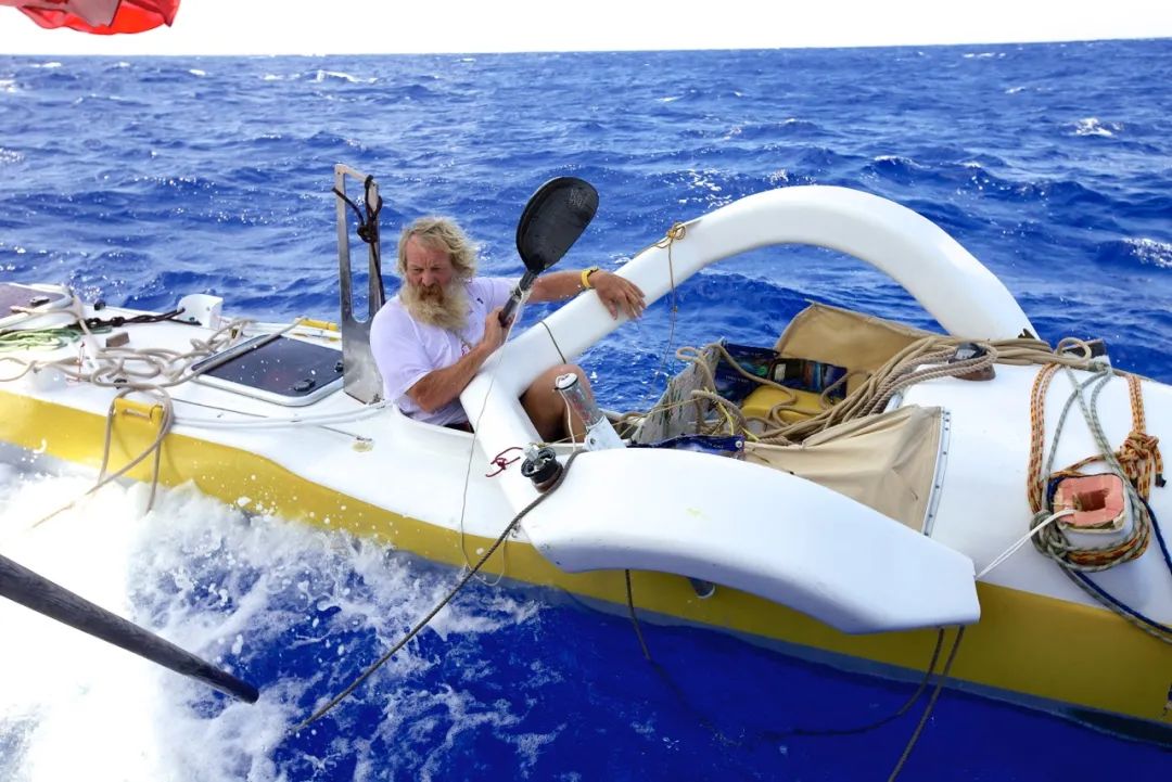 他借土著的树脂填补破洞,捡海边的枯木充当船桨,桨断了用手,手麻了用腿。