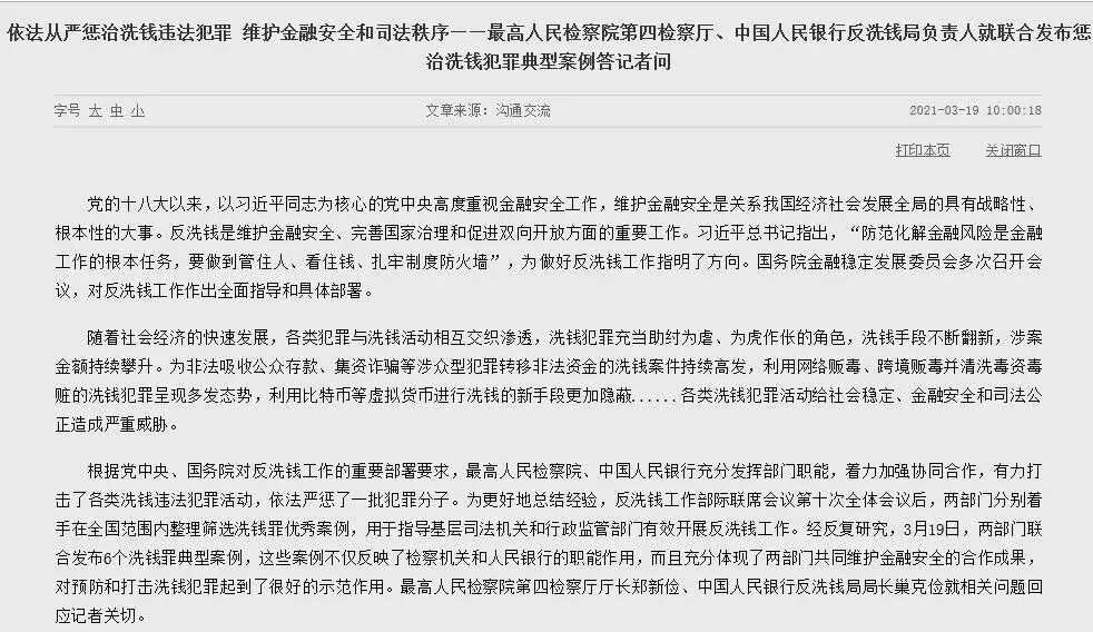 办案过程中,上海市人民检察院向中国人民银行上海总部提示虚拟货币领域洗钱犯罪风险,建议加强新领域反洗钱监管和金融情报分析。中国人民银行将本案作为中国打击利用虚拟货币洗钱的成功案例提供给国际反洗钱组织——金融行动特别工作组,向国际社会介绍中国经验。