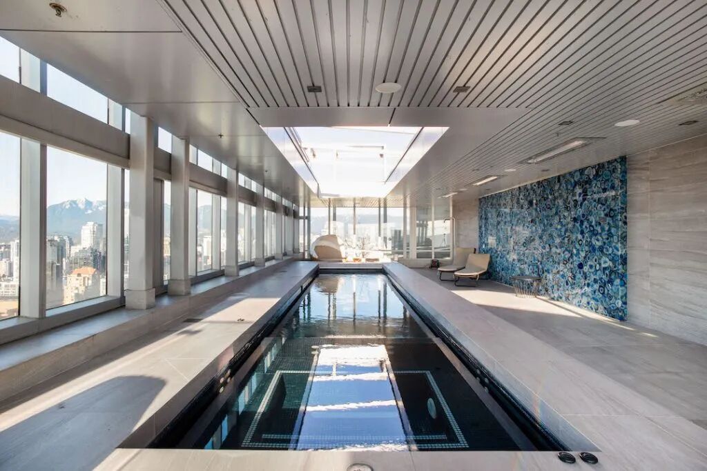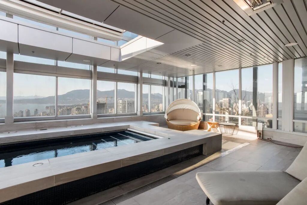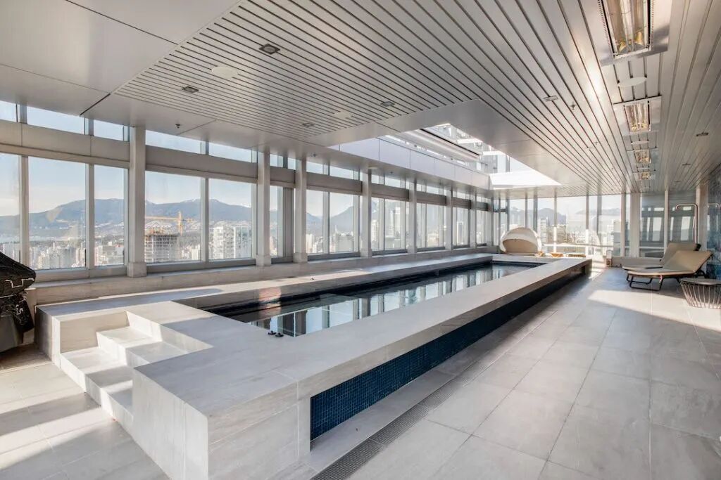 更加奢侈的是,在阳台区域,它还拥有一个长达二十米的私人室内泳池,而且面朝北方,海景、山景、城市天际线一览无余。光是这个豪华私人泳池,一个月的“单独租金”就得好几千吧?