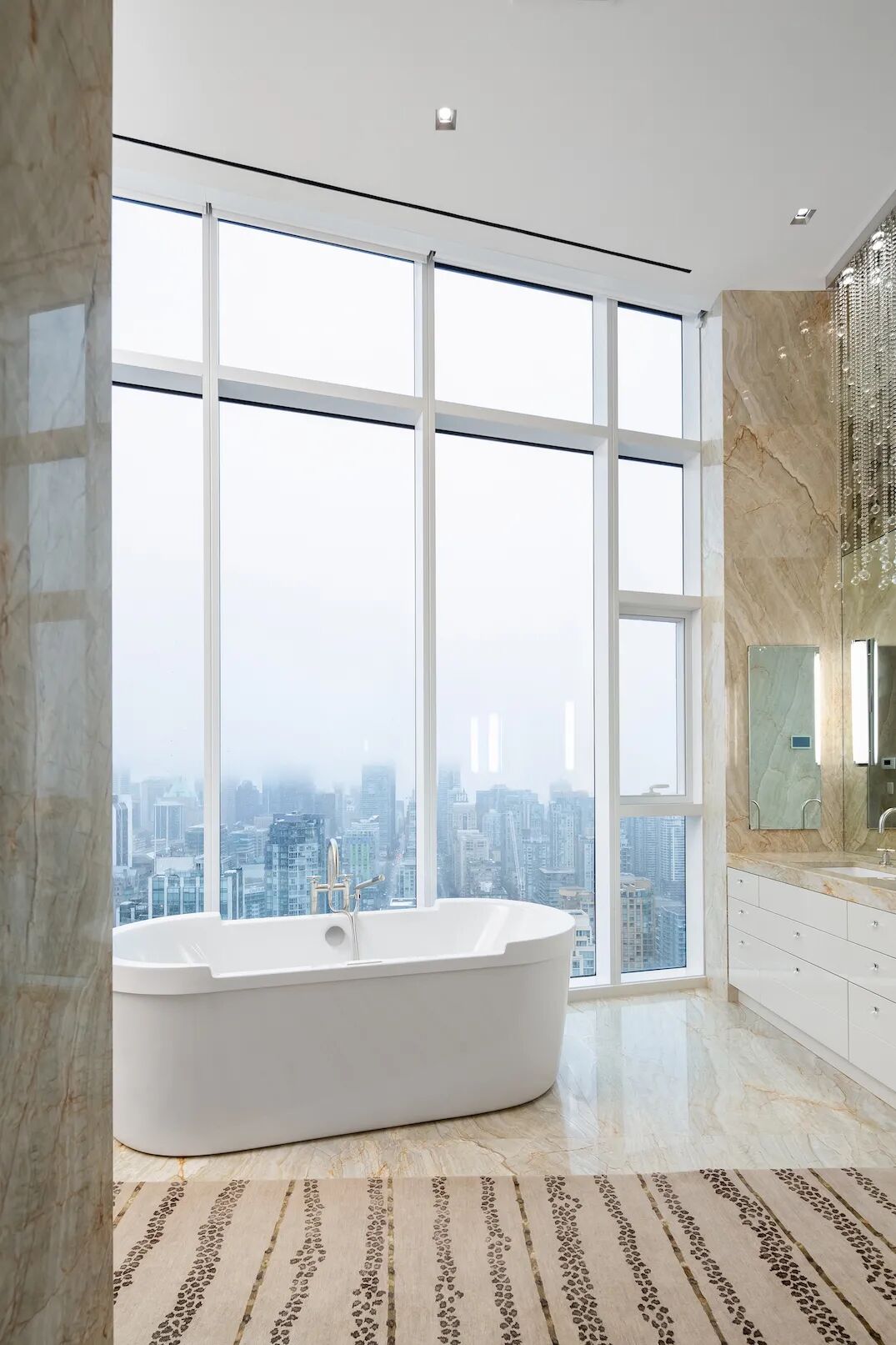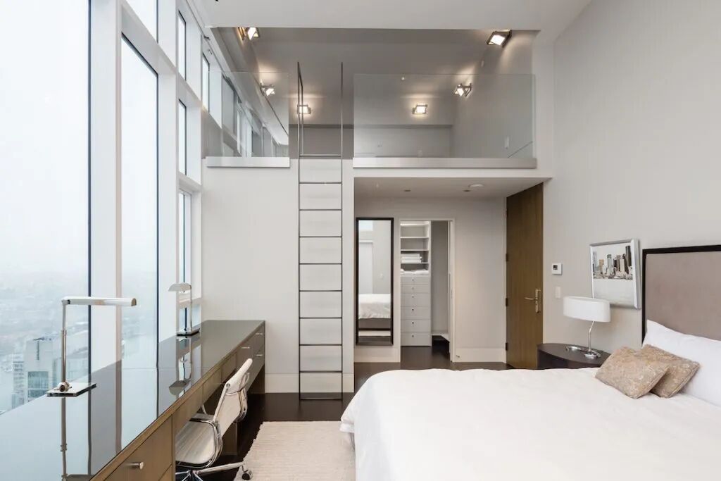 不同于很多豪华公寓的主卧室只有一面落地窗,这套Penthouse的主卧室位于角落位置,拥有西北和东北两个方向的落地窗,享受双重景观,仿佛置身云端……