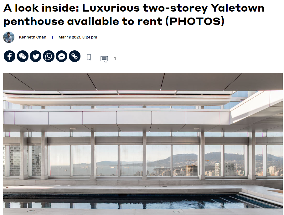 如果2000、3000的租金已经让你受不了了,近期多家媒体报道的“温哥华最贵出租房”,绝对让你惊掉下巴:位于市中心耶鲁镇1372 Seymour街的高层公寓47楼,每月租金价格是令人咂舌的45000元!