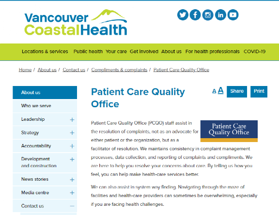 (温哥华海岸卫生局病患护理办公室 图自温哥华海岸卫生局官网)