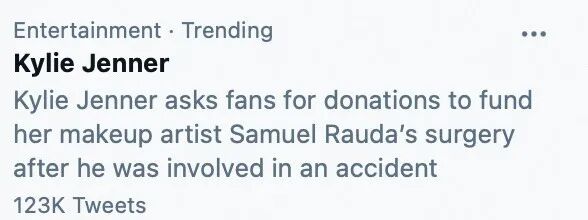 而这次前化妆师遇车祸,估计凯莉也是像朋友圈的转发似的,请求粉丝帮忙捐钱,要知道卡戴珊家族很擅长用自己的影响力呼吁粉丝捐款。