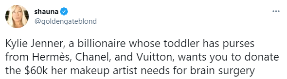 凯莉·詹娜,一个连家里小孩子都能拥有各大奢侈品的亿万富豪,却想要你捐钱凑齐6万给她的化妆师做手术↓