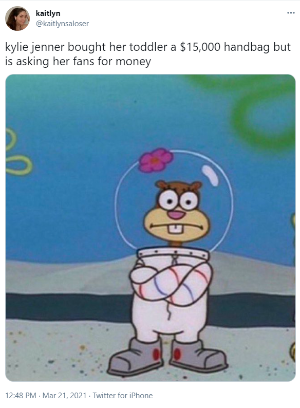 凯莉·詹娜给她家孩子买15000美金的包,却还要问粉丝要钱(筹款)↓