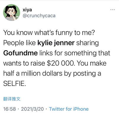 你知道我觉得哪里最搞笑吗?像凯莉这样的人,随随便便发张自拍都能进账百万,现在却在转发筹款链接来凑两万块钱↓