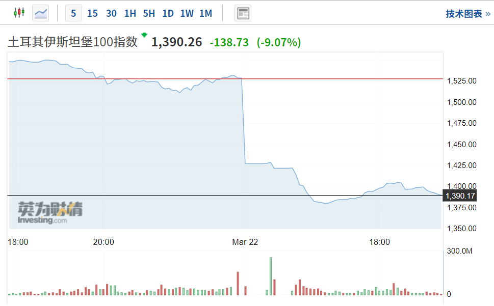 据央视新闻报道,土耳其伊斯坦布尔100指数今日开盘即大跌6.65%,伊斯坦布尔证券交易所宣布启动熔断机制,一直熔断至当天上午的10时30分。这是土耳其股市2020年10月引入熔断机制以来首次触发熔断。
