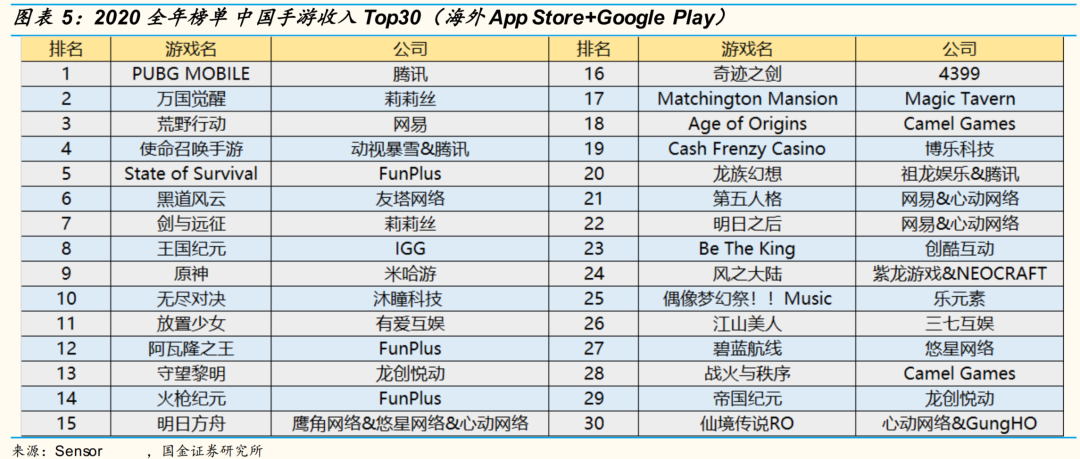 国内游戏行业,鹅厂一家独大的局面早已经形成,但是在海外,鹅厂还不具备国内这样的领先地位,2020年Sensor Tower中国手游海外收入榜单上,前十的游戏只有《PUBG MOBILE》是鹅厂的,另一个是鹅厂与动视暴雪合作的。
