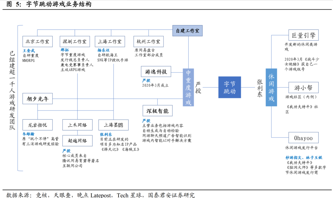 2017年,字节收购朝夕光年,2018年调整了朝夕光年的业务,开始转型做游戏。2019年又收购了上禾网络、上海墨鹍和深极智能,2020年继续投资了麦博游戏、有爱互娱、神罗互娱、风暴之心等游戏研发商,逐渐形成了中重度游戏与休闲游戏并行的业务架构: