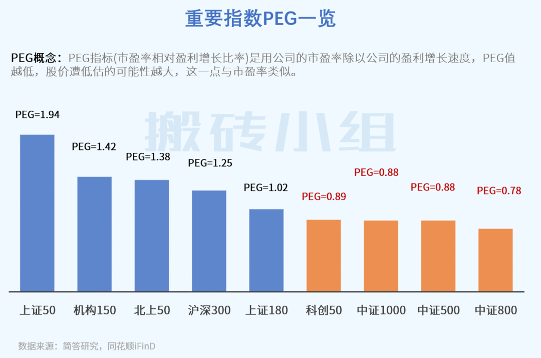 前几天看到一个有意思的研报,张夏写的策略。内容就是春节后,中小盘个股股指开始修复,小盘价值(399377)是逆势上涨的,大家开始关注起了PEG≤1这个指标。我也翻了一下几个重要指数的PEG: