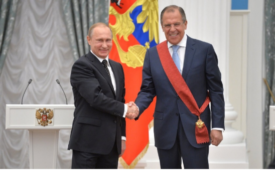 2015年3月31日,俄总统普京(左)授予外长拉夫罗夫一等“祖国功勋”勋章。