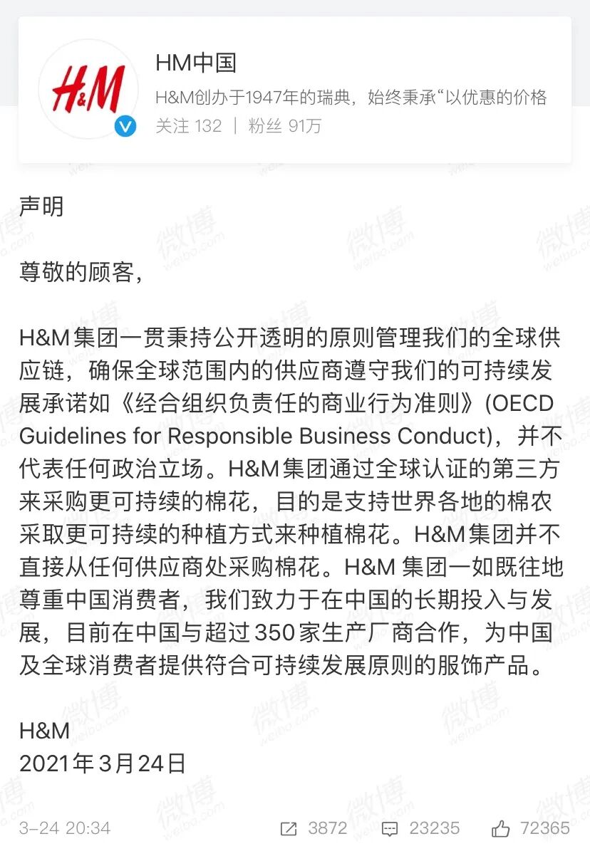 面对汹涌的舆情,24日晚间,H&M中国官方微博发布声明予以回应:
