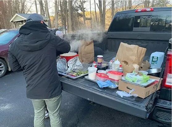 他和他的团队一开进公寓大楼的停车场,就给丽娜·琼斯发短信说他们到了,然后就开始工作。他们拉下小货车的门,把电炉挂在卡车的电源端口上,开始做起饭来。