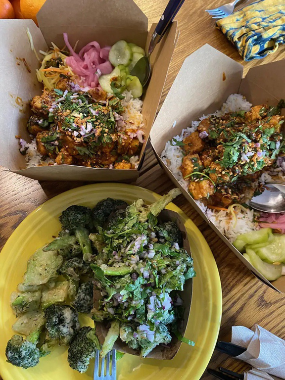 除了西兰花天妇罗,他们还用花生酱、新鲜香草和米饭做了一道炸豆腐前菜。把所有饭菜整整齐齐装好后,他们敲开了顾客的前门。