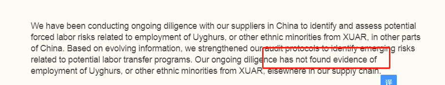 同时,当我们仔细阅读NIKE的声明时,我们发现他在文中的用词是”has not found evidence”(没有发现证据),也就是说我没直接用新疆的棉花,我们的溯源工作也很复杂。但我们没发现有“强迫劳动”。