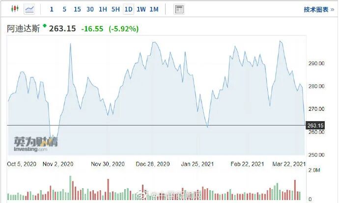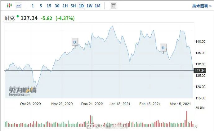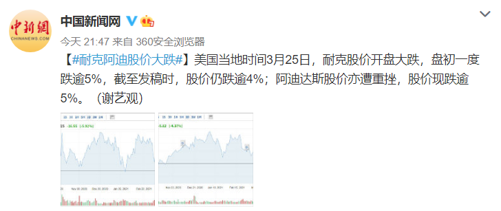 美国当地时间3月25日,耐克股价开盘大跌,盘初一度跌逾5%,截至发稿时,股价仍跌逾4%;阿迪达斯股价亦遭重挫,股价现跌逾5%。