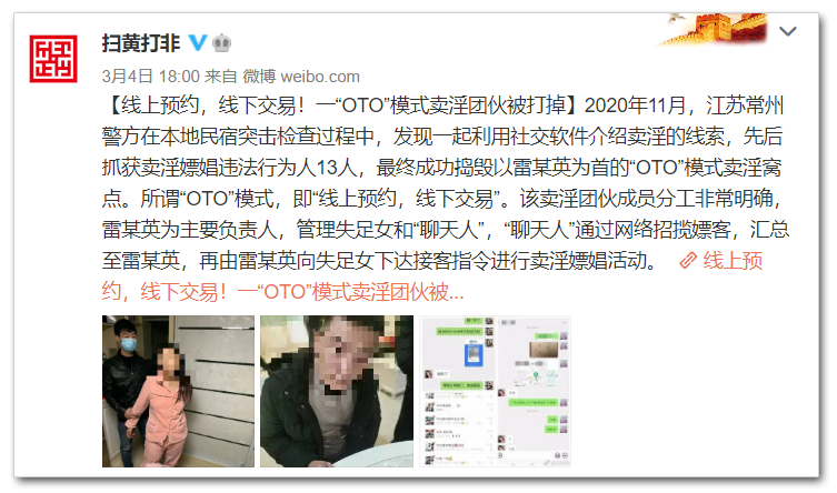 线上预约,线下交易,颠覆色情业的青楼O2O终于被曝光2021-03-25 |作者: | 来源:北美报告中国Loading...分享: 1. 直追美团,青楼O2O曝光! 互联网的战火已经烧到了色情,这个最古老的行业。 最近,国家扫黄打非办曝光了一起O2O卖淫案件,线上预约,线下交易,谁也没想到犯罪团伙的互联网思维竟已如此高超。 他们怎么操作的呢? 首先,主犯雷某英从老家招募一支团队,成员互为亲戚、情侣关系,并且来自同一个村。 她们彼此间配合默契,执行力超强,这样就不费吹灰之力打造了一个严密组织,堪比阿里巴巴的中供铁军。 然后,“聊天人”通过网络社交平台招揽“顾客”,谈好价格,雷某英负责分发到“小姐”接客。 线上预约,线下交易,分工明确,走得完全是美团的路子。 最后,雷某英按照每单的35%提成结算给“聊天人”,35%提成给失足女,剩下30%归自己。 不仅如此,她还给所有团队成员提供底薪,以及不论“业绩”都包吃包住的优待,这一点很多互联网公司都自愧不如。 在极具竞争力的分成激励下,“小姐”们一个个如狼似虎,服务直追海底捞,“翻台率”高得让人咂舌。 2. 青楼O2O猖獗背后,是互联网的堕落! 什么是O2O? O2O就是“Online To Offline”的简称,翻译过来就是我们上面所说的“线上预约,线下交易”。 在互联网越来越下沉的今天,违法分子借助各类功能强大的社交APP连线失足女和嫖客,打通最后一公里,被称为“O2O模式的卖淫嫖娼”。 大家可能不太了解,最近这些年青楼O2O愈演愈烈,防不胜防。 2019年6月,无锡警方破获了一起020卖淫案。 原本暂停营业的养生会馆,为什么总有宝马奔驰接客送客? 原来一名叫罗某的男子在网络上雇佣一批“推手”,通过小卡片将“单男”转到微信社群,谈好服务和价格,最后导流到会所。 2020年2月,广西梧州破获“5·29”大案。 招嫖卖淫团伙在网络平台发布各种各样的“美女”照,吸引单男加微信。 创始团队把项目落地到梧州,自己却在深圳遥控、管理。所谓运筹帷幄之中,决胜千里之外,钞票像流水一样哗啦啦流进来。 我们再来看看震惊全国的深圳青楼O2O世纪大案。 前几年,深圳警方侦破了一宗“互联网+”卖淫案,揭开了所谓外围女的神秘面纱。 这是青楼O2O首次曝光。 犯罪团伙怎么做的呢? 首先,通过网络在全国各地广招失足女,雇佣专业摄影师拍照,包装成高级外围女。 其次,建立多个微信群,把外围女、经纪人和推手聚到一起,将分散的卖淫女以营销模式进行聚合推广,规模高达数千人。 这起大案作为典型的青楼O2O,几乎囊括了“互联网+”的所有形式,让人目瞪口呆! 一是跨界融合。 它将卖淫与整容、摄影以及形象推广服务融合成一体,衍生出一系列下游产业链。 二是“创新”驱动。 它以外围女为基础,创新出一系列营销噱头,甚至复刻出古代青楼的玩法。 比如,他们培养外围女学习英语和打高尔夫,专门猎杀商业人士,有的外围女英语达到了专八水平。 三是重塑结构。 外围女向兼具组织介绍双重身份转变,这种有点类似传销组织,成员数量像雪球一样迅速滚大。 四是开放生态。 每个外围女是一个个独立个体,以利益共享为核心,去中心化,将群员打造成微信涉黄生态圈。 五是连接一切。 犯罪团伙通过史无前例的资源聚集能力,开发出传统涉黄、网络涉黄等多种变现渠道,卖淫嫖娼变得前所未有的便捷。 看看,这就是一个涉黄团伙牛逼的互联网思维。 卖淫嫖娼线上化让我想起一个知名的互联网人——孟醒。 说孟醒这个名字可能大家不太了解,但说雕爷就熟悉了,没错,他就是把一碗面卖到两三百块钱的雕爷牛腩创始人。 雕爷把自己的成功之道总结为十六个字:收窄客群,创新价值,颠覆行业,阐述未来。 毫无疑问,青楼O2O彻底复制了互联网+的那套打法,发展势头迅猛,颠覆传统行业只是时间问题。 3. 青楼O2O背后的真相 我们看到,在查处的嫖客中,有的是高知学者,有的是企业高管,还有的是在校学生,他们纷纷拜倒在青楼O2O的石榴裙下。 真是不胜唏嘘! 有人问我,各类阶层纷纷沦陷,青楼O2O到底是怎么精准猎杀的? 第一步,寻找猎物 犯罪团伙通过微信“附近的人”寻找“猎物”,利用虚拟定位软件在繁华地带发布色诱信息。 很多人不太了解虚拟定位软件,其实程序员高手只需安装一个插件,就能把你的手机定位到全国任何一个地方,甚至是国外。 也就是说,他们人在深圳,就能把自己定位到东莞的娱乐场所,通过微信“附近的人”、抖音同城、陌陌同城等社交功能,发布各式各样的“美女”照,用一些淫秽、暴露、浮想联翩的词汇,引诱单男。 图:警方缴获作案手机 单男们以为对方是楚楚动人的嫩模,实际上对面现场却是几百台手机插在电脑上,机器人海量发布黄图。 精心包装的微信号,诱人的相册和带着生活气息的朋友圈,彷佛散发出腥味的诱饵。 图:警方出示外围女工作手机截图 一旦受害人上钩,系统就会自动切换到专业聊手团队洽谈,就像是人工转客服一样。 第二步,线上谈价 聊手接单后,通过转化率最高的话术迅速和单男谈妥价格和地点。 这时,无论你在全国任何一个城市,都会有美女开好房间等你,因为所有外围女都在同一个平台上。 传统色情业的信息壁垒,就这样被彻底颠覆了。 第三步,线下交易 聊手搞定线上环节后,就会形成一个记载地址、价格、电话等信息的“订单”,系统自动派送给嫖客所在城市的卖淫团伙。 图:警方公布青楼