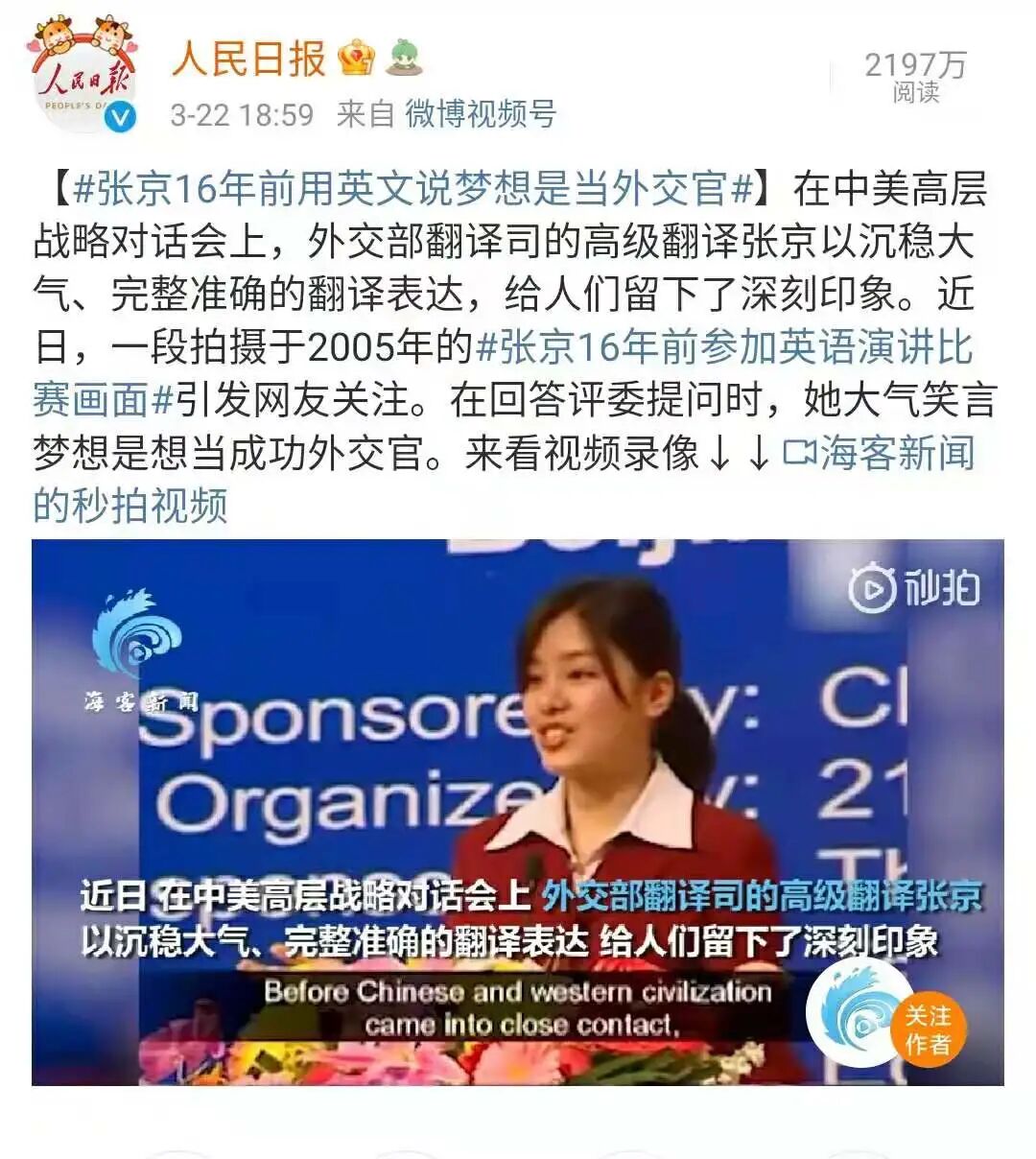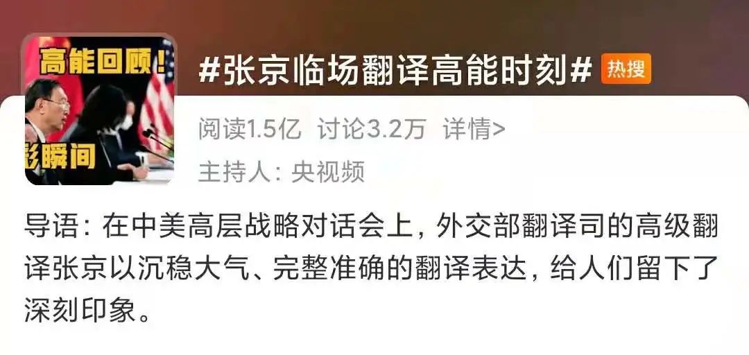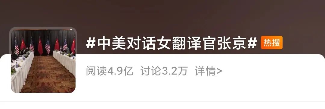 与此同时,#中美对话女翻译官张京#、#张京16年前用英文说梦想是当外交官#、#张京临场翻译高能时刻#的话题热搜也接连不断。