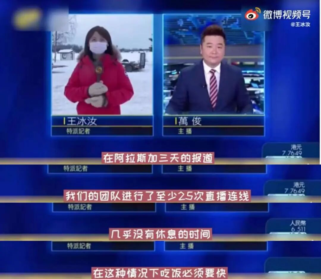 在阿拉斯加三天的报道中,王冰汝进行了至少25场直播连线,几乎没有休息的时间。