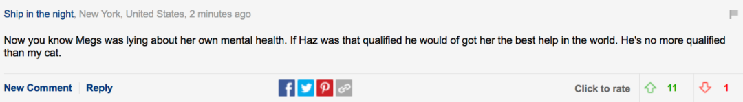 有的网友说:“现在你知道梅根说自己抑郁是在撒谎。如果哈里有资格指导心理问题,那梅根就能得到最好的帮助。他还没我的猫有资格。”