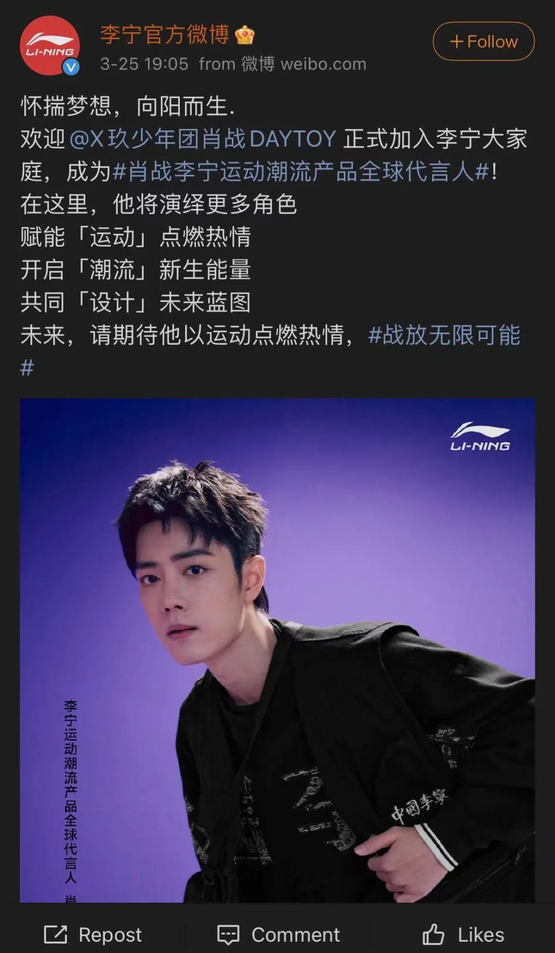 截至发稿前,李宁宣布签约肖战,抛开艺人本身的争议不谈,内娱流量开始支持国产,至少算是本土品牌一个好的开始吧。