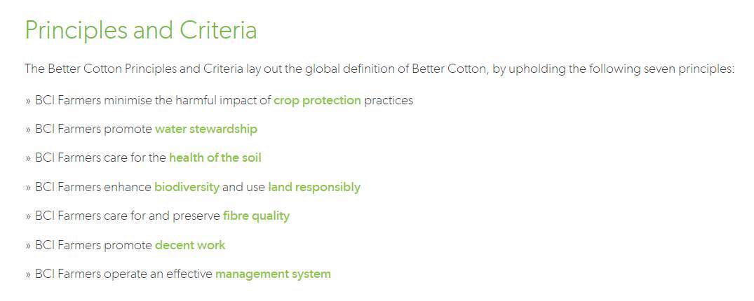来看看所谓的良好标准都是什么:将对作物保护措施有害的影响降至最低、高效用水与保护水资源、重视土壤健康、保护自然栖息地、关心和保护纤维品质、提倡体面劳动、运行有效的管理系统。