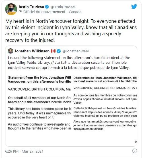 特鲁多在得悉北温凶杀案后不久,即发出推文表达他的哀伤,“今晚我的心在北温哥华。谨此向那些受林恩谷暴力事件影响的每个人致意,每个加拿大人心中都挂念着这件事,并希望伤者尽快康复。