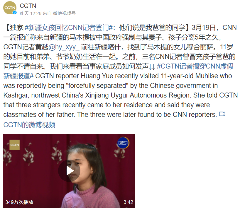 3月19日,CNN一篇报道称,来自新疆的马木提被中国政府强制与其妻子、孩子分离5年之久。最近,CGTN记者前往新疆喀什,找到了马木提的女儿穆合丽萨。11岁的她目前和弟弟、爷爷奶奶生活在一起。之前,三名CNN记者曾冒充孩子爸爸的同学不请自来。