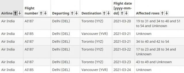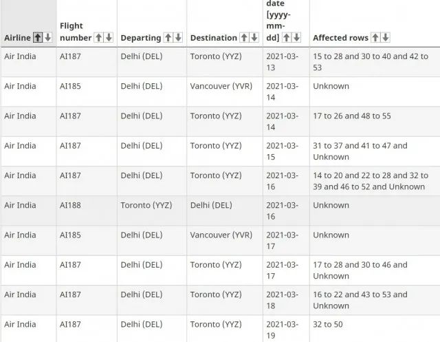 从加拿大卫生部公布的列表上可以看到,在3月13日至24日期间,从新德里出发的抵加航班每一天都有乘客被确诊。