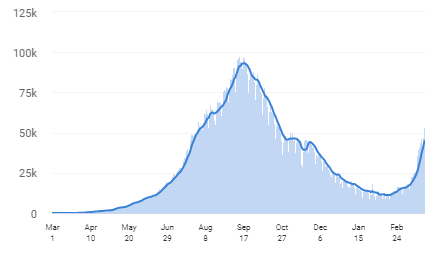 昨日,印度报告了53476例病例,是最近5个月以来的单日最高新增病例数量。但政府表示,病例的激增与这些变体之间没有联系。目前各州已经开始重新引入限制措施,包括宵禁和间歇性的封锁,以控制病毒的传播。印度首都德里和孟买已经下令在机场、火车站和购物中心等拥挤地区进行随机快速检测。