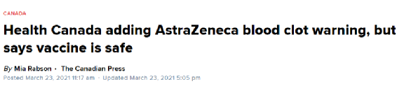 3月25日,加拿大公共卫生署(PHAC)称,阿斯利康疫苗“有可能”与“非常罕见但严重的血栓病例有关”,且该联邦政府部门已在阿斯利阿康疫苗的瓶剂上贴上了“血栓”的警示标识。但加拿大卫生部坚持认为,该疫苗的优势依旧大于其弊端,并建议65岁以下的人群可以继续接种。
