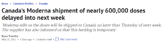 再把眼光拉回加拿大,阿斯利康疫苗的安全性先暂时按下不表,祸不单行的是,莫德纳疫苗也不能按时交货了。