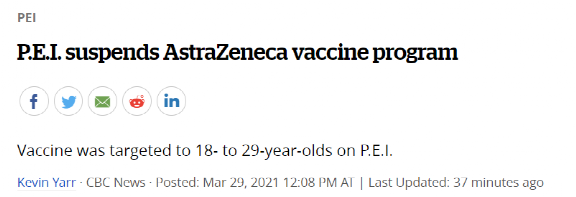 据CBC报道,率先行动的是爱德华王子岛,该省3月29日一早就宣布暂停为18到29岁的省民接种阿斯利康疫苗。