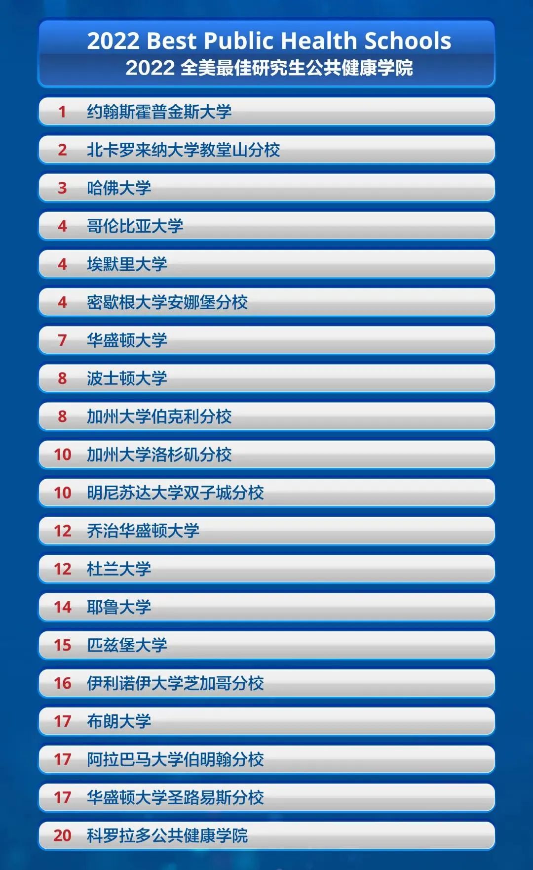 在公共健康学院排名中,JHU、北卡罗莱纳教堂山分校、哈佛瓜分前三名额;哥大、埃默里、UMich并列第4名;UCB和UCLA,这两所加州系名校分别排第8位和第10位。